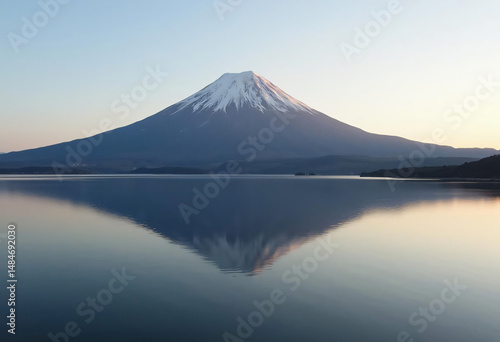 © Macholicious, Fototapeta premium Snow Capped Mountain Reflected on Calm Lake at Peaceful Sunrise