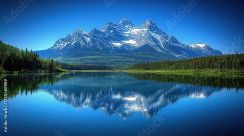 Fototapeta premium Snow - Capped Mountain Reflecting in a Serene Lake with Forested Shoreline