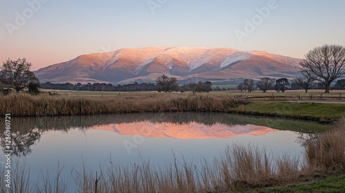 © Biancaart, Obraz premium Snow Capped Mountain Reflecting in Pond at Dusk Serene Countryside View