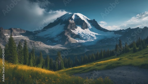 Fototapeta premium Snow-capped mountain with lush green forests and a vibrant meadow under a...