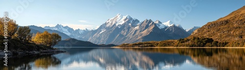 Naklejka premium Snow-capped mountains reflected in a clear blue lake, majestic landscape,...