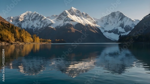 Fototapeta premium "Snow-capped mountains reflecting perfectly in a calm lake surrounded by...
