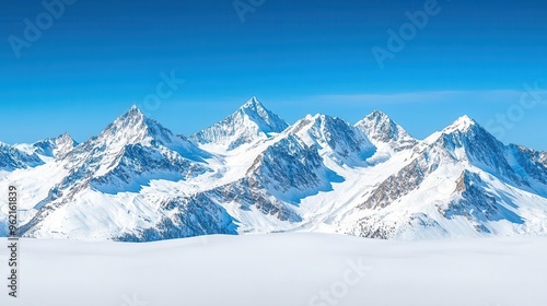 Fototapeta premium Snow-capped mountains under a clear blue sky, winter weather, cold and majestic