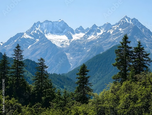 Obraz premium Snow-capped mountains with trees.