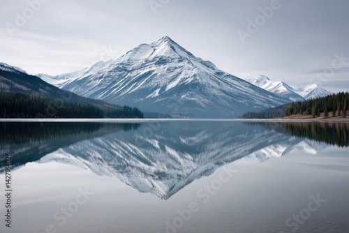 Naklejka premium Snow capped peak reflects perfectly in a calm alpine lake showcasing serene...