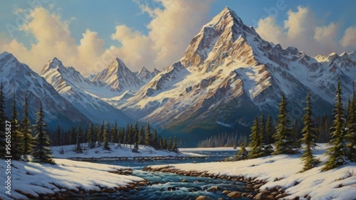 Fototapeta premium Snow-capped peaks oil painting