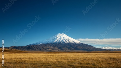 © musa, Obraz premium Snow-capped volcano landscape, autumn field, clear sky, travel postcard