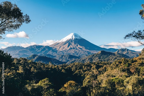 © Muhammad, Fototapeta premium Snow-capped volcano view through trees
