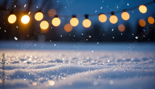 Obraz premium snow cover in the foreground, bokeh garland in the blurred background