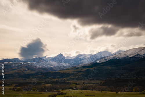 © Michael J Magee, Naklejka premium 2022-03-29 SNOW COVERED ABSAROKA MOUNTATIN RANGE AND VALLEY NEAR PRAY MONTANS WITH BLURRY FAST MOVING STORM CLOUDS