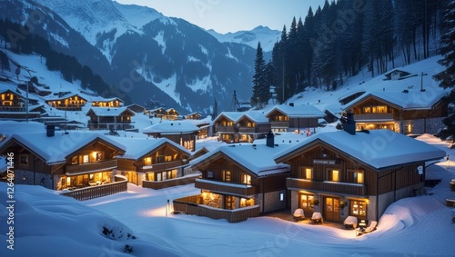 © RaksaLinggo, Fototapeta premium Snow covered alpine village with illuminated wooden chalets
