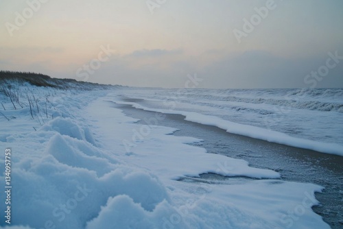 © Валерий Тодаренко, Obraz premium Snow-covered beach at dawn with gentle waves and tranquil winter atmosphere