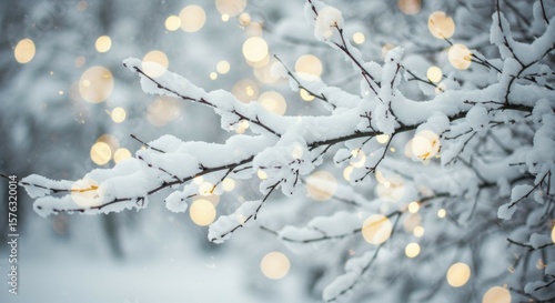 © Samesta Art, Fototapeta premium Snow Covered Branch with Winter Lights Decoration