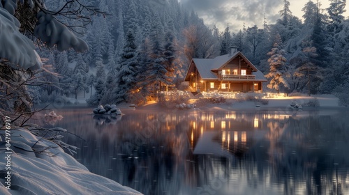 © Kingboy, Fototapeta premium Snow-covered cabin by a frozen lake in a winter wonderland