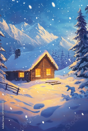 Naklejka premium Snow-covered cabin glows, nestled in snowy mountains.
