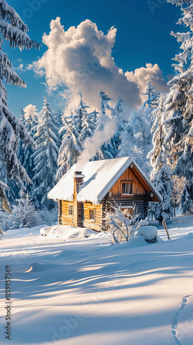 © Jafree, Fototapeta premium Snow-Covered Cabin in a Winter Landscape Surrounded by Pine Trees and Clear Blue Sky. Concept of Winter Tranquility, Solitude, Nature's Beauty, and Cozy Retreat. Vertical