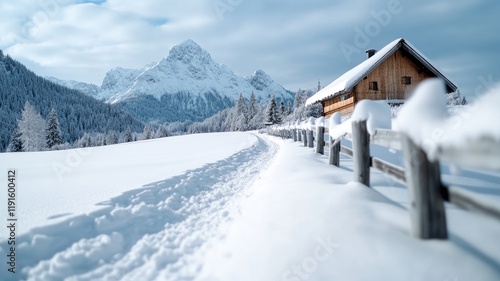 © MagiCraft, Fototapeta premium Snow-covered cabin in winter with mountain backdrop and clear sky