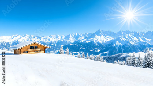 Fototapeta premium Snow-covered cabin nestled in a serene winter forest landscape,