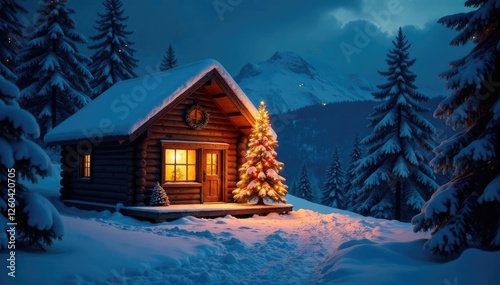 © Prasert, Fototapeta premium Snow-covered cabin with Christmas tree lightning in the windowsill, sparkling lights, cabin