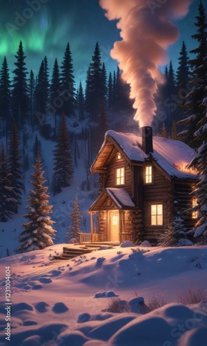 Fototapeta premium Snow-covered cabin with smoke rising from chimney amidst winter forest, aurora borealis displays above, aurora, northern lights