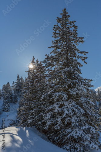 Fototapeta premium snow covered conifer tree in alpine winter landscape with sun