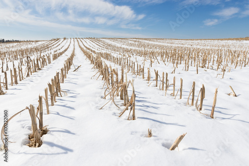 © junej, Fototapeta premium Snow Covered Corn Field in Winter
