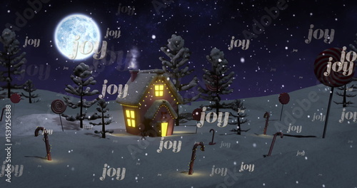 Naklejka premium Snow-covered cottage radiating glow in forest under full moon, with candy canes and smoking chimney