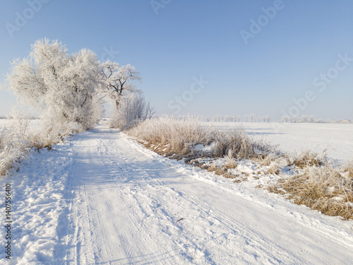 Obraz premium Snow Covered Country Road in Winter Landscape
