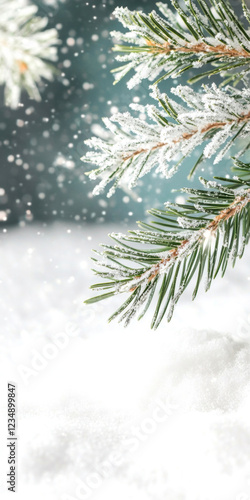 © smth.design, Obraz premium Snow covered evergreen branches with falling snowflakes serene winter scenery