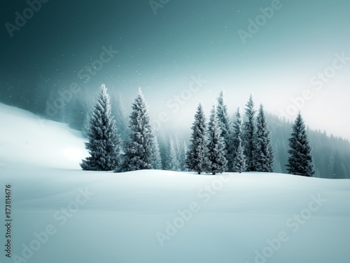 Naklejka premium Snow-Covered Evergreen Forest in a Winter Wonderland with Falling Snowflakes,...