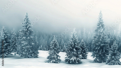 © Sofia, Naklejka premium Snow covered evergreen trees in a forest landscape with a foggy background in winter season scene