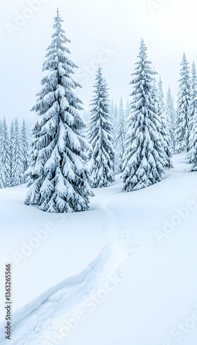 Naklejka premium Snow-covered evergreen trees in a winter wonderland, path through deep snow