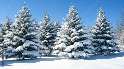 © savittree, Naklejka premium Snow-Covered Evergreen Trees Standing Majestically in Winter Wonderland Under Clear Blue Sky with Soft White Snow Blanketing the Ground