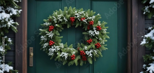Naklejka premium Snow-covered evergreen wreath on dark green wooden door, snowy exterior,...