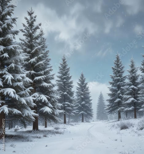 © Janmo, Fototapeta premium Snow-covered fir trees gazing out from against a soft blue winter landscape with a few flakes gently falling in the air , peaceful atmosphere, blue winter landscape, natural beauty