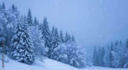 © PhotoArtHub, Fototapeta premium Snow-covered fir trees in a tranquil, snowy landscape, representing winter, calmness, and the beauty of nature, suitable for serene concepts