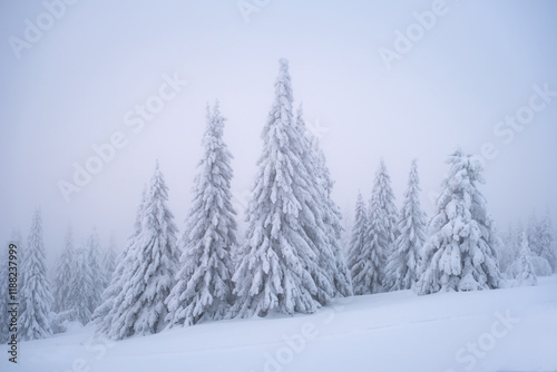 © 02irina, Fototapeta premium Snow-covered fir trees in the fog in the mountains of the Southern Urals