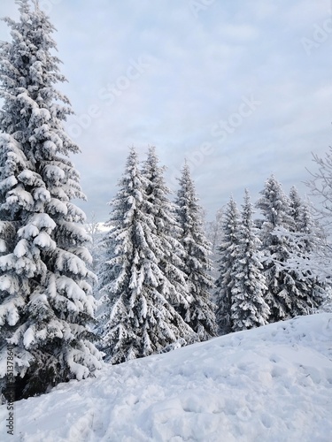 Fototapeta premium Snow-covered fir trees. Winter landscape with copy space. Krasnaya gorka village, Pinega district, Arkhangelsk region.