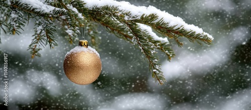 © DigitalDruid, Obraz premium Snow-covered fir twigs adorned with golden ornaments creating a festive outdoor Christmas scenery during a gentle snowfall