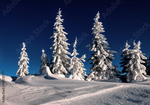 © Volodymyr Shevchuk, Fototapeta premium snow-covered firs under sunlight