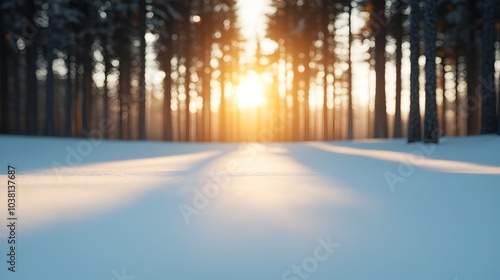 Naklejka premium Snow Covered Forest at Sunrise with Filtering Light