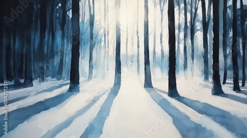 © Lakkhana, Naklejka premium Snow-covered forest glowing under a pale winter sun, frosted trees casting long shadows, mist rising from the icy ground, serene and chilling