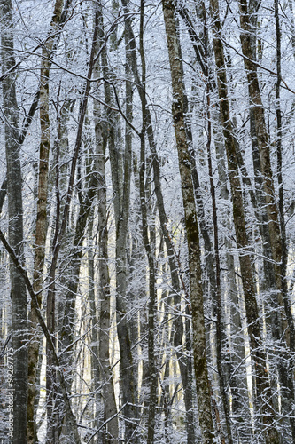 © andreanita, Fototapeta premium Snow covered forest in winter with sunrise in background.