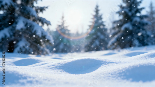 Fototapeta premium Snow-covered forest landscape with falling snowflakes and evergreen trees in...