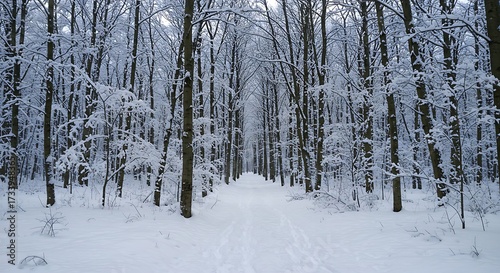 Fototapeta premium Snow covered forest path scene winter landscape with bare trees