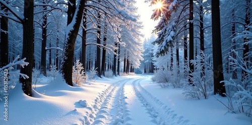 Naklejka premium Snow-covered forest path winding through trees, nature, landscape, snow