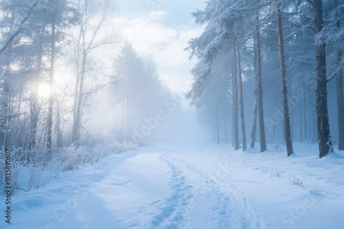 Naklejka premium Snow-covered forest path with sunlight filtering through frosty trees on a misty winter morning