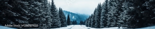 © BrandwayArt, Fototapeta premium Snow-covered forest road in winter with tall pine trees and fog