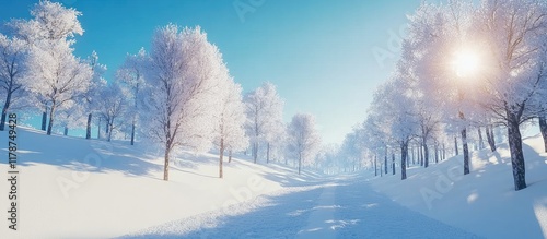 Naklejka premium Snow-covered forest road under bright sunlight with trees lining a pristine...