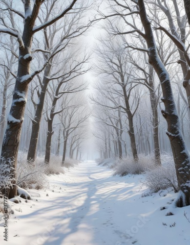 © chaiwat, Obraz premium Snow-covered forest with bare trees and icy branches, bare trees, serene